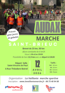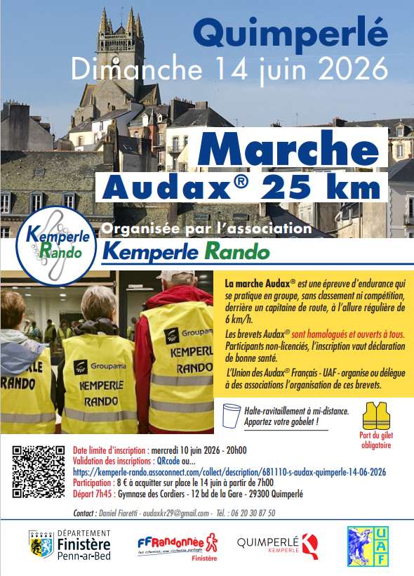 Kemperle Rando organise sa première Audax, marche d’endurance de 25 km à 6 km/h, le dimanche 14 juin 2026 à Quimperlé. Date limite d’inscription : mercredi 10 juin 2026, participation : 8 €, départ 7h45 du Gymnase des Cordiers – 12 bd de la Gare