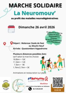 La troisième édition de la Marche Solidaire La Neuromouv’ est lancée pour soutenir les personnes touchées par les maladies neurodégénératives. Organisée en partenariat avec Le Studio Bien-être, les Maisons de Santé de Questembert et de Malansac, BO Rando Questembert, ainsi que la FFRandonnée Morbihan, cette journée associe activité physique, solidarité et sensibilisation autour d’une cause de santé publique majeure.